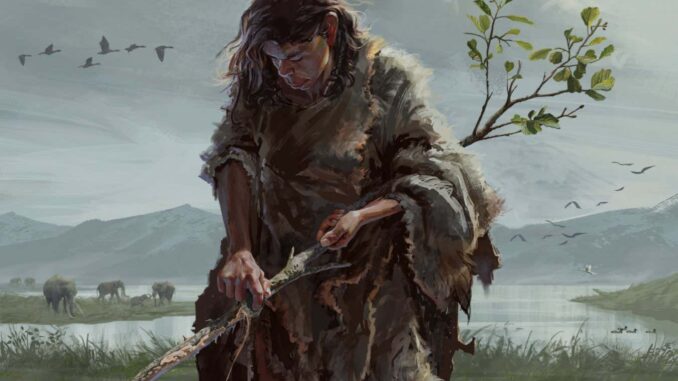 Artist’s reconstruction of a Paleolithic woman making a digging stick from an alder trunk