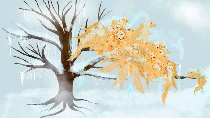 That is indeed a lot of loving, fluffy dogs. Feedback We’re not sure if this image of over 100 dogs slowly drifting down a tree really helps people understand the dangers of freezing rain, but we won’t argue.