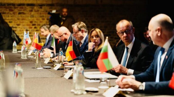 Giorgia Meloni and Friedrich Merz talk during the mini-summit this Thursday