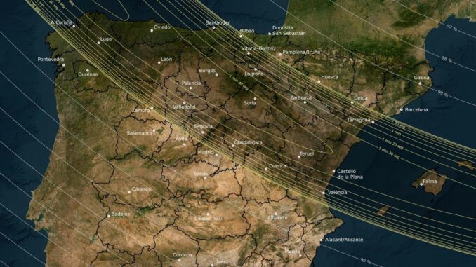 A total eclipse can be seen in the northern polar regions, parts of Greenland and Iceland and between the areas of the Atlantic Ocean, you will visit the Iberian Peninsulafrom which all the French will enter north and cross part of the communities of Galicia, Asturias, Cantabria, Castilla y León, País Vasco, Navarra, Madrid, Castilla-La Mancha, La Rioja, Aragón, Cataluña and Comunidad Valenciana to pass through the Balearic Islands; in the rest of Spain it will be considered partial.