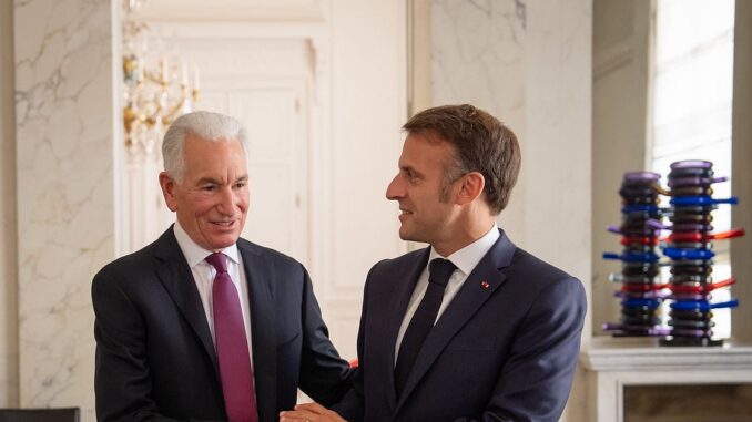 Kushner with President Macron shortly after being appointed ambassador to Paris.Facebook of the US embassy in Paris