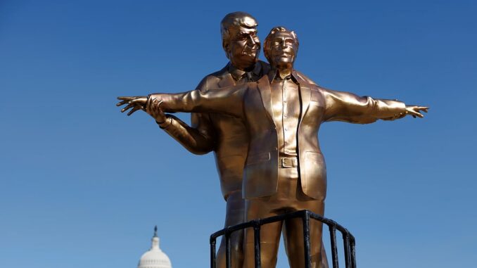 A golden statue depicting US President Donald Trump and late pedophile Jeffrey Epstein in the famous scene between Jack and Rose on the bow of the Titanic emerged this week on The Mall in Washington.