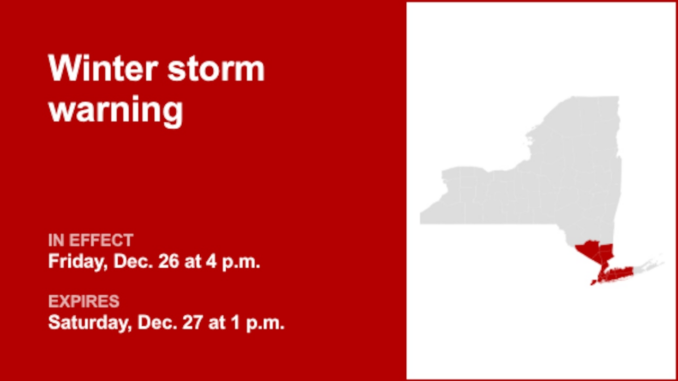 The National Weather Service issued a Winter Storm Warning at 1:19 PM Thursday for North Westchester, South Westchester, Richmond (Is.), Kings (Brooklyn), Northwest Suffolk, Southwest Suffolk, North Queens, North Nassau, South Queens and South Nassau, as well as Bronx Orange, NewMan Putnam, Count Rockx Orange, NewMan Putnam, from 4:00 PM Friday until 1:00 PM Saturday.