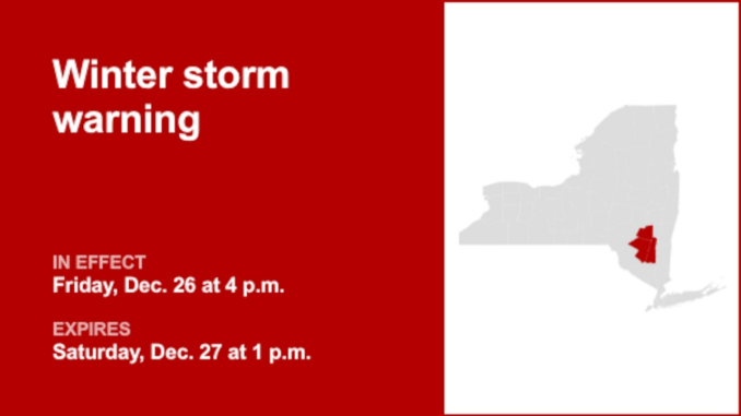 The National Weather Service issued a winter storm warning at 12:34 p.m. Thursday, in effect from 4 p.m. Friday until 1 p.m. Saturday for western Greene, western Ulster and eastern Ulster.