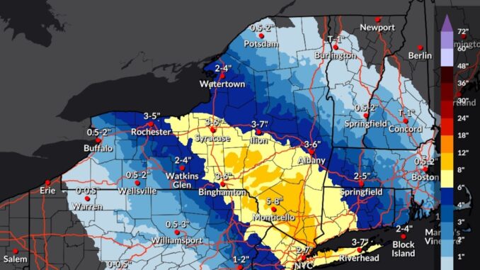 Snow totals should decrease towards the north and east. Syracuse is in the forecast for 3 to 6 inches of snow.