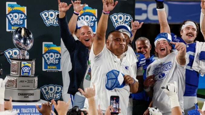 (Kevin Kolczynski | AP) BYU head coach Kalani Sitake eats a Pop-Tart during the trophy presentation after defeating Georgia Tech in the Pop-Tarts Bowl on Saturday.