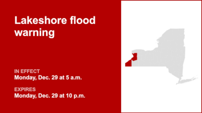 At 1:50 a.m. Sunday, the National Weather Service issued a lakeshore flood warning in effect for Monday between 5 a.m. and 10 p.m. for North Erie and South Erie, as well as Chautauqua County.