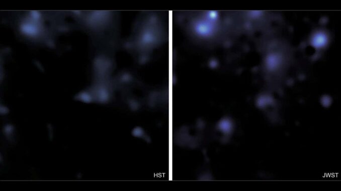 The distribution of dark matter as observed by the Hubble Space Telescope (left) and the James Webb Space Telescope (right)
