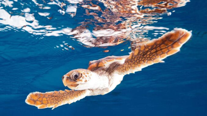 A young loggerhead turtle in the Caribbean Sea near the Bahamas