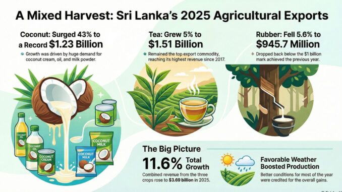 Sri Lanka’s coconut-based exports hit record in 2025; rubber dips, tea edges up