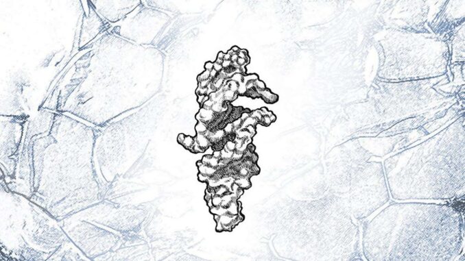 Artist’s rendering of QT45 (based on AlphaFold3 prediction) overlaid with a micrograph of the frozen environment that aids RNA replication
