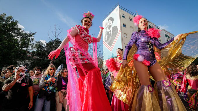 The Colombina Clandestina block parade, on Saturday, was lucky enough to bring the sun back to Lisbon after several days. Thousands of people filled the streets and brought the joy of Carnival. On Sunday, the sky was cloudy, but the streets of Penha de França were green and gold, to the rhythm of the forró music from the Qui Nem Jiló block.