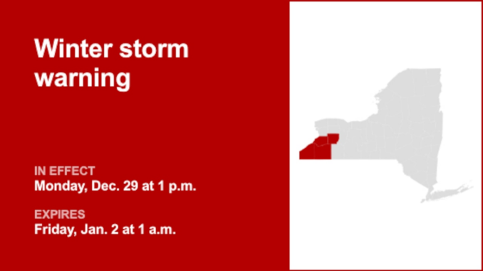 The National Weather Service issued a winter storm warning at 2:22 a.m. Sunday, in effect from 1 p.m. Monday until 1 a.m. Friday for southern Erie as well as Wyoming, Chautauqua and Cattaraugus counties.
