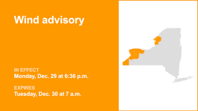 At 6:36 p.m. Monday, the National Weather Service issued a wind advisory in effect until 7 a.m. Tuesday for North Erie and South Erie, as well as Niagara, Orleans, Monroe, Jefferson, Genesee, Wyoming and Chautauqua counties.