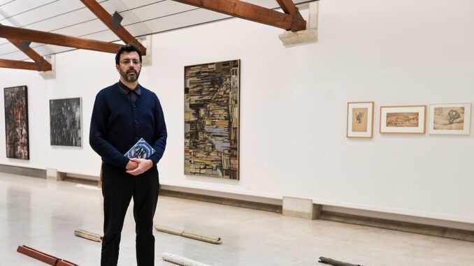 Nuno Faria, director of the museum, next to works by Vasco Futscher on the floor. Photo: Paulo Spranger