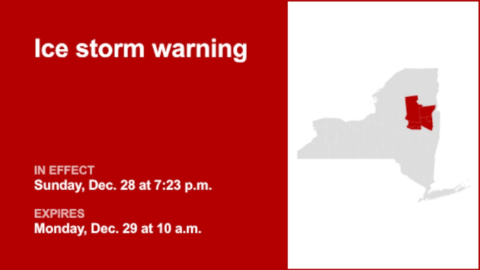 At 7:23 p.m. Sunday, the National Weather Service issued an Ice Storm Warning in effect until 10 a.m. Monday for South Fulton, North Saratoga, North Warren, North Fulton and Southeast Warren, as well as Hamilton County.