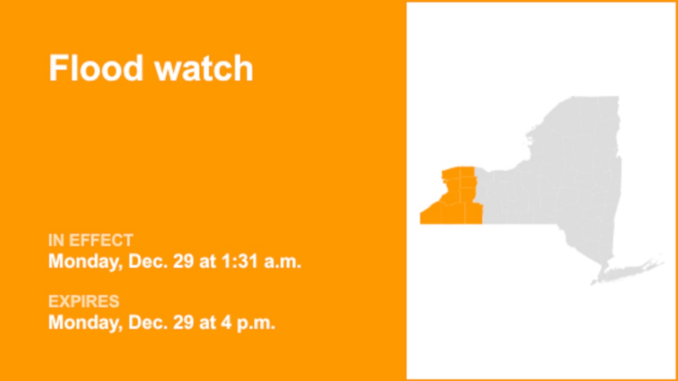 At 1:31 a.m. Monday, the National Weather Service issued a flash flood watch in effect until 4 p.m. for North Erie and South Erie, as well as Niagara, Orleans, Genesee, Wyoming, Chautauqua, Cattaraugus and Allegany counties.