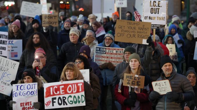Syracuse, NY – More than 1,200 people rallied in downtown Syracuse Monday afternoon to protest the Trump administration’s crackdown on immigrants and the killing of a Minnesota woman by a federal agent last week.