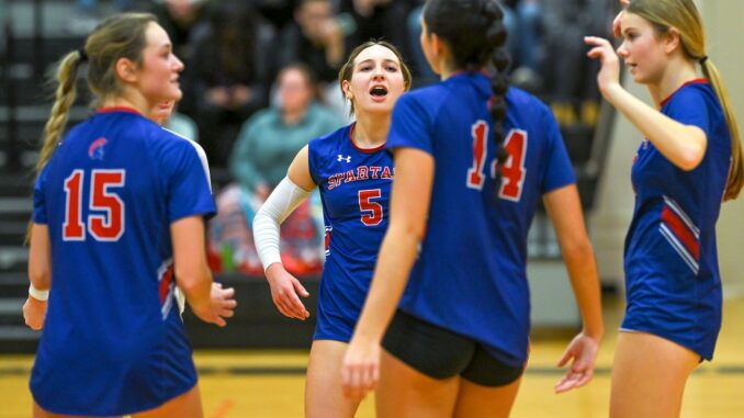 Ashlee Fisher finished with 20 kills, 32 digs, a block and an ace for the Spartans. Keegan Matthews chipped in 22 kills, six blocks, 19 digs and five aces. Clare Colantuoni collected 60 assists Riley Heenan provided 38 digs and two aces.