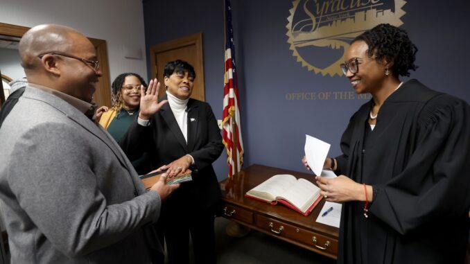 Owens sworn in as mayor of Syracuse: In a historic moment for the city of Syracuse, Sharon Owens was sworn in Wednesday night to become the city’s first black female mayor. Her husband Shaun held the Bible during the ceremony; Syracuse Municipal Court Judge Staci Dennis-Taylor administered the oath of office. Owens, 62, is the city’s 55th mayor in its 177-year history. She is the second woman in this position. (photo by Dennis Nett)