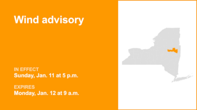 The National Weather Service issued a wind advisory at 12:11 a.m. Sunday for north Saratoga and north Fulton from 5 p.m. until 9 a.m. Monday.
