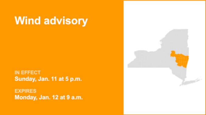 At 12:31 p.m. Sunday, the National Weather Service issued a wind advisory in effect from 5:00 p.m. until 9:00 a.m. Monday for South Herkimer, South Fulton, West Schenectady, East Schenectady, South Saratoga, West Albany, East Albany, West Rensselaer, East Rensselaer, West Greene, East Greene, West Columbia and East Columbia, as well as Schöneberg and Schenectady counties.