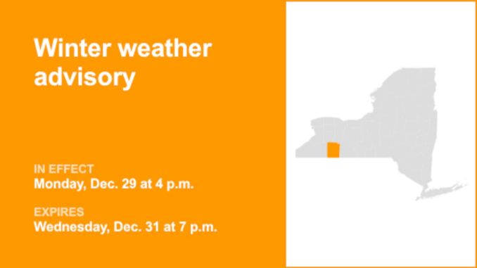 At 3:45 a.m. Monday, the National Weather Service issued a Winter Weather Advisory in effect from 4:00 p.m. until 7:00 p.m. Wednesday for Allegany County.
