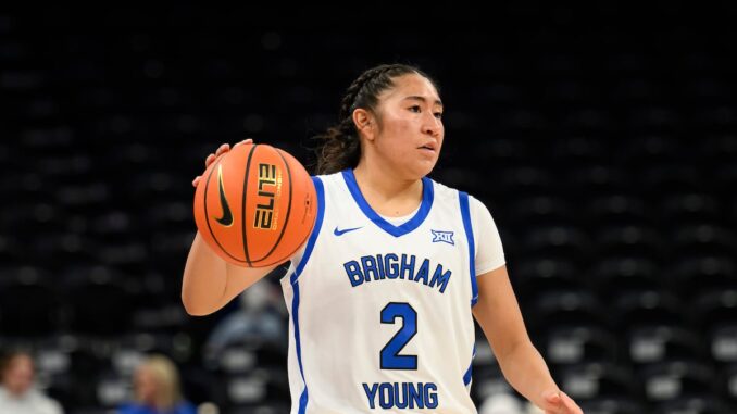 (Tyler Tate | AP) Brigham Young guard Sydney Benally looks to pass the ball during the first half of a game against Washington State on Dec. 3, 2025, in Salt Lake City.