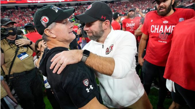 (Leah Hogsten | The Salt Lake Tribune) Kyle Whittingham and Morgan Scalley celebrate together after Utah won the Pac-12 title.
